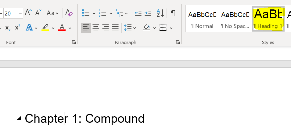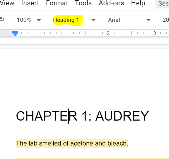 Then, make sure that you have page breaks at the end of every chapter. For the chapter headers, you also need to choose the correct formatting or it won’t convert to a Kindle book properly. Use the Heading 1 style setting in Google Docs…