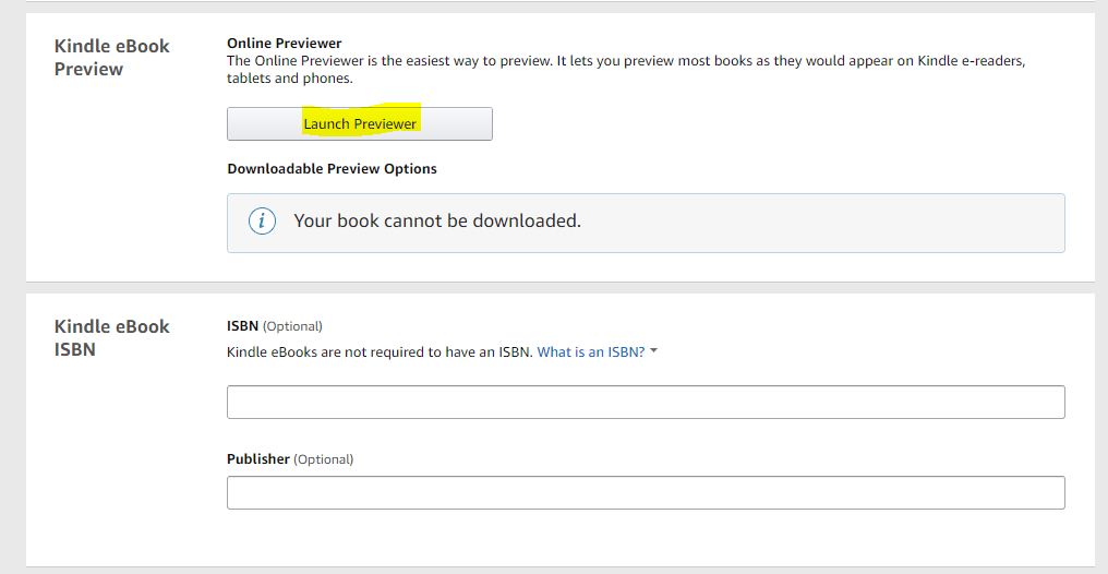 You can preview what your book will look like, by clicking the Launch Previewer button. It isn’t necessary to create an ISBN number for the eBook. We will create that with the physical print edition in the next step.