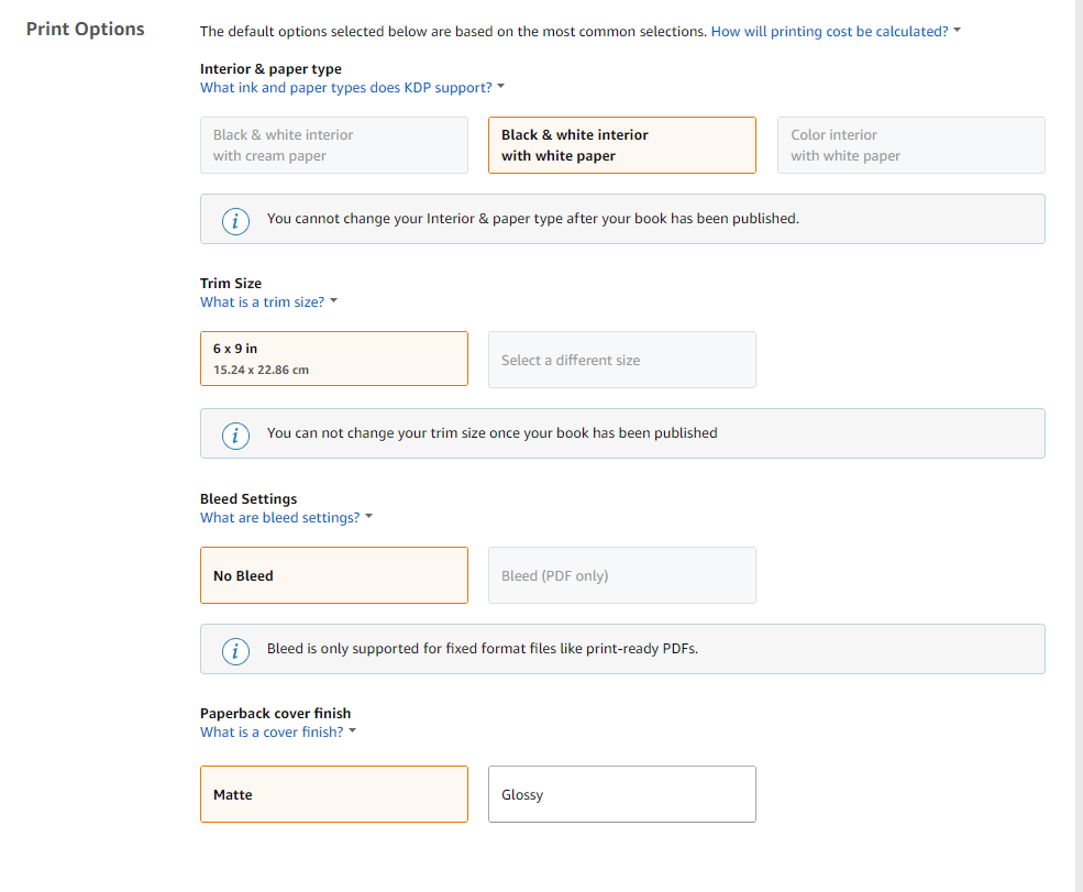 For Manuscript, just upload the file that you created for the eBook with Kindle Create as I instructed above. As long as you use the options in the screen shot above for a 6×9″ print, your KPF file will work perfectly for the print version as well.