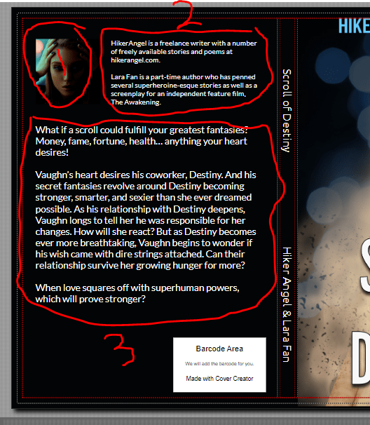 Next, click on the following areas to create the back cover. In area 1, upload a photo of yourself. In area 2, type a blurb about yourself. In area 3, type in the product description that you created for the Amazon page that describes your book. The spine will automatically populate with your author name and book title, though you can click to edit it if you want to.